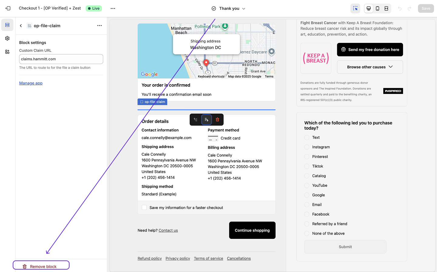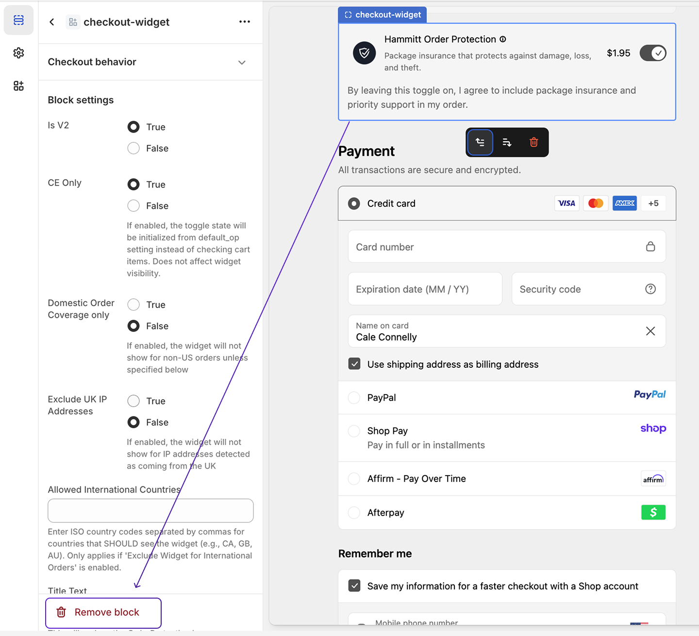 the live theme.CheckoutClick on the widget within checkout to bring up the widget settings. Click Remove Block