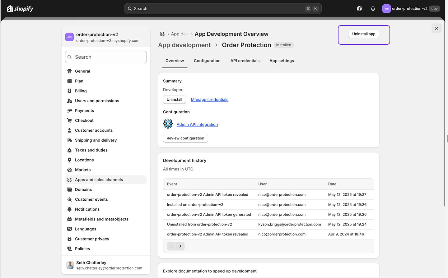 to remove the app from your store. This will sever all webhooks. This will also block Order Protection from taking any claim resolution actions within your store (reshipments, refunds, or store credit) so ensure that you have no outstanding